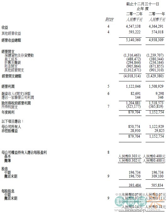除了上述因素經(jīng)營(yíng)利潤(rùn)下降也受以下因素影響:(i)某些旗艦店提早續(xù)簽租賃協(xié)議產(chǎn)生額外租金及物業(yè)管理開支人民幣86,500,000元;(ii)向642合資格雇員授出購股權(quán)產(chǎn)生開支人民幣19,100,000元;及(iii)內(nèi)地附屬公司計(jì)劃將來派發(fā)股息所產(chǎn)生的預(yù)扣稅人民幣16,500,000元。特許專柜銷售錄得增長(zhǎng)4.7%,略微超過直接銷售,并占商品銷售總額約90.4%,直接銷售增加4.4%,占商品銷售總額約9.6%。