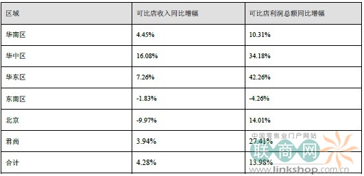 注:可比店指2011年1月1日以前開設(shè)的門店,報告期內(nèi)可比店實現(xiàn)了收入同比增長4.28%,利潤總額同比增長13.98%。