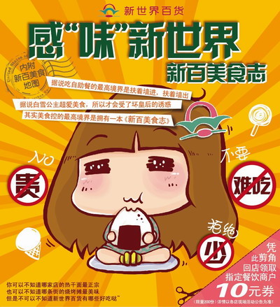 不擅長網(wǎng)絡(luò)游戲?沒關(guān)系,新世界百貨還貼心地為美食控們特別定制了《新百美食志》。無論線上搶奪,還是線下任意購物滿300元獲贈,按圖索驥,勢必都能找到屬于你的那款美味。