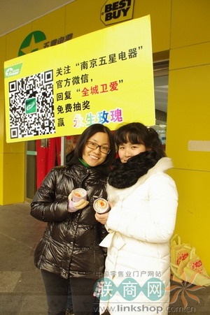 聯(lián)商網(wǎng)消息:昨日,在南京新街口地鐵站,一行舉著大展板的五星電器工作人員分外奪人眼球。不少市民感到好奇,紛紛上前詢問(wèn),原來(lái)是五星電器展開的一項(xiàng)“全城衛(wèi)愛”活動(dòng)。通過(guò)南京五星電器的官方微信號(hào)即可參與免費(fèi)抽獎(jiǎng),獎(jiǎng)品是永生玫瑰一朵,而只要有幸運(yùn)兒抽中一朵永生玫瑰,五星電器就將向賽虹橋老人公寓捐獻(xiàn)50元。在元宵節(jié)和情人節(jié)共同到來(lái)之際,老人們和情侶們都可以過(guò)一個(gè)難忘的“雙節(jié)”。