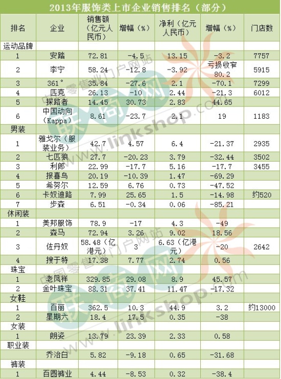 聯(lián)商網(wǎng)消息:2014年的第一季度已經(jīng)結(jié)束,國內(nèi)多家服飾類上市公司已經(jīng)發(fā)布2013年度業(yè)績公告(部分企業(yè)為業(yè)績快報(bào))。聯(lián)商網(wǎng)綜合整理了24家國內(nèi)服飾上市企業(yè)(包括鞋履和珠寶)的業(yè)績數(shù)據(jù),并根據(jù)銷售額進(jìn)行了分類排名。
