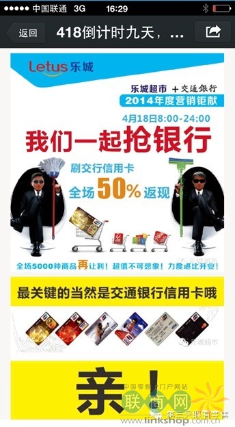 這本是交通銀行聯(lián)合全國上百家超市開展的“刷交行卡,享受50%折扣”的活動。樂城借題發(fā)揮,制造“搶銀行”話題,吸引關注。并且通過包裝給人感覺是樂城主動發(fā)起的活動。得到了很好的效果,對此,交通銀行也頗為滿意。