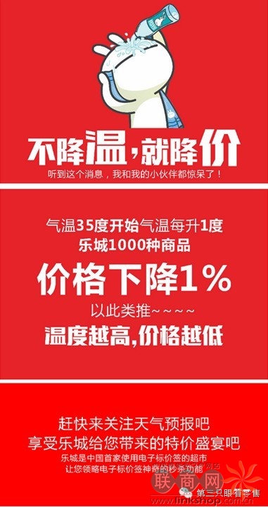 去年夏天合肥天氣異常熱,都快到秋季了,還是燥熱難耐,持續(xù)40度高溫。樂城這個時候推出,氣溫以35度為基數(shù),每升高一度,樂城就降價1%。用商品利潤的損耗來取代天氣炎熱帶給消費者心中的苦悶,達到了非常好的效果。