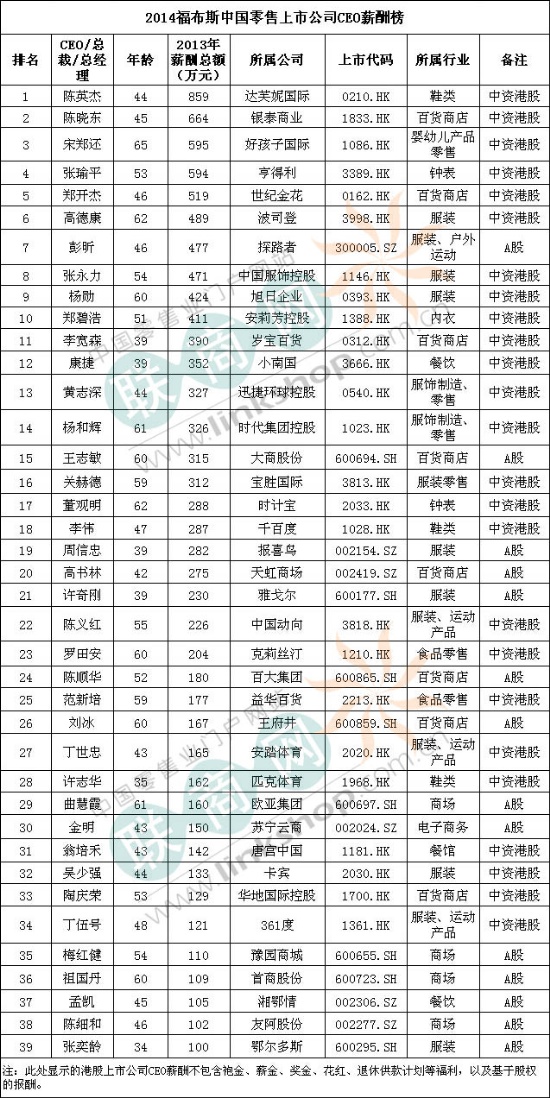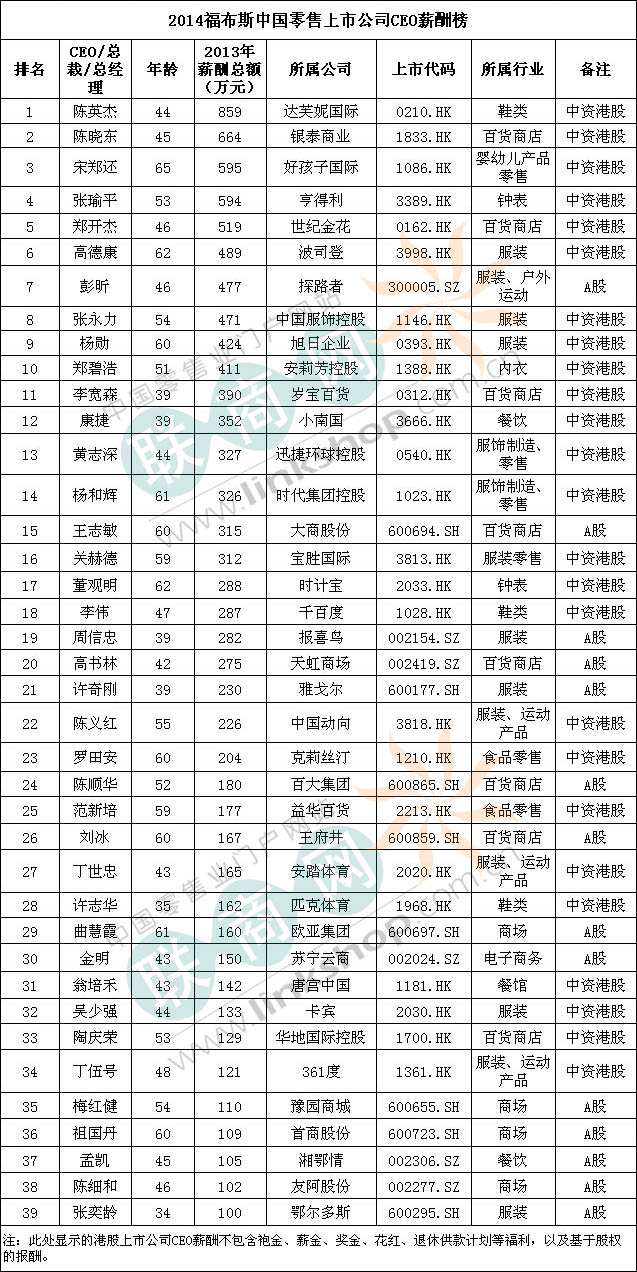 具體榜單及排名詳見下表:(數(shù)據(jù)來源:福布斯2014年中國(guó)上市公司CEO薪酬榜)