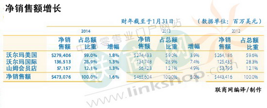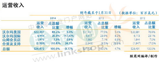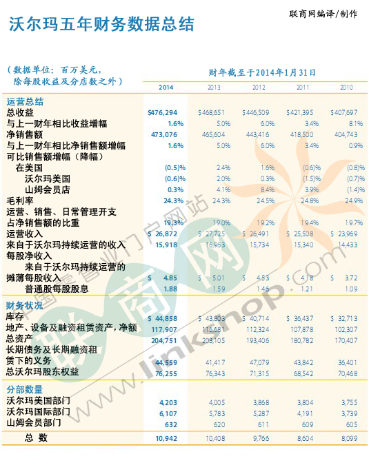 2014財年沃爾瑪年報之關鍵財務數(shù)據(jù) 來源: 聯(lián)商網 2014-07-22 16:18 聯(lián)商網前言:沃爾瑪在其官網發(fā)布了其2014財年的年報,聯(lián)商網編譯了其中關鍵財報數(shù)據(jù)供網友參考。 。(lián)商網獨家編譯,轉載請務必注明出處!)