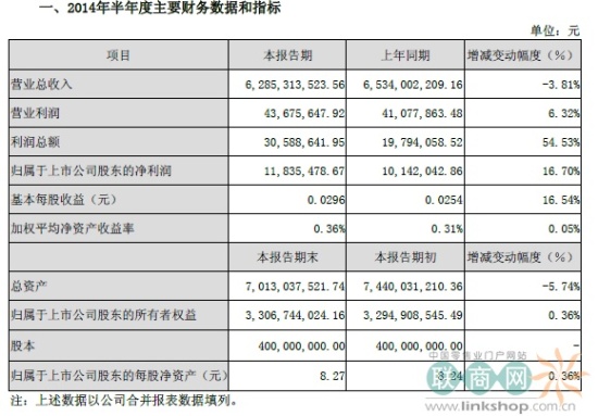 對(duì)于營(yíng)業(yè)收入下降但利潤(rùn)增長(zhǎng)的現(xiàn)象,公司解釋稱,營(yíng)業(yè)收入下降的主要原因是部分可比門店銷售收入同比出現(xiàn)下滑。利潤(rùn)增長(zhǎng)的主要原因是公司通過強(qiáng)化毛利率管控,2014年上半年綜合毛利率較去年同期增長(zhǎng)1.54個(gè)百分點(diǎn);同時(shí)上半年關(guān)店損失較去年同期減少所致。