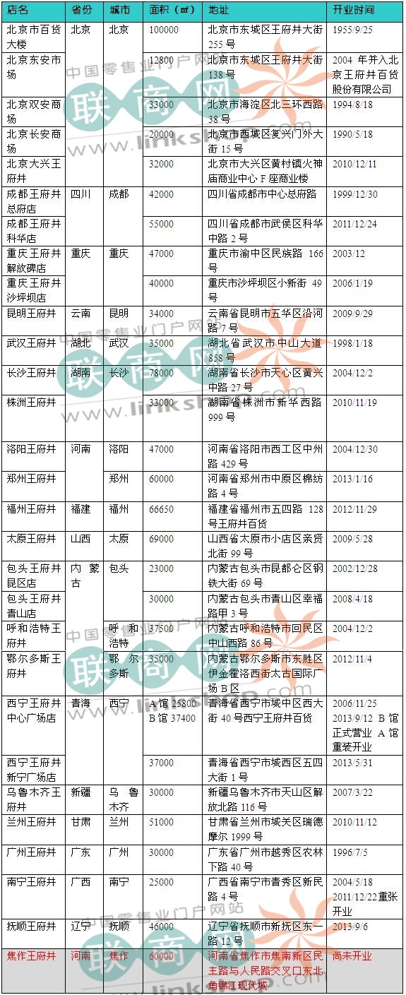 以下是聯(lián)商網(wǎng)整理統(tǒng)計的王府井百貨全國門店分布一覽: