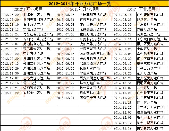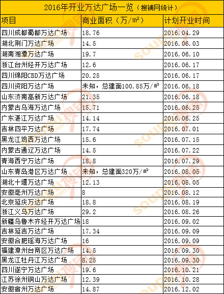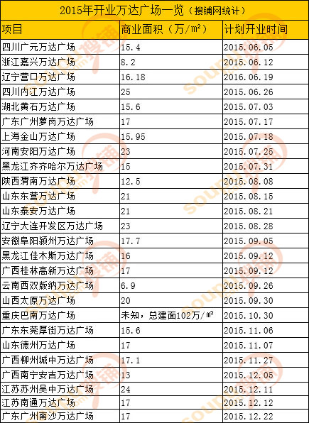 萬達(dá)廣場2015-2016年開業(yè)項(xiàng)目