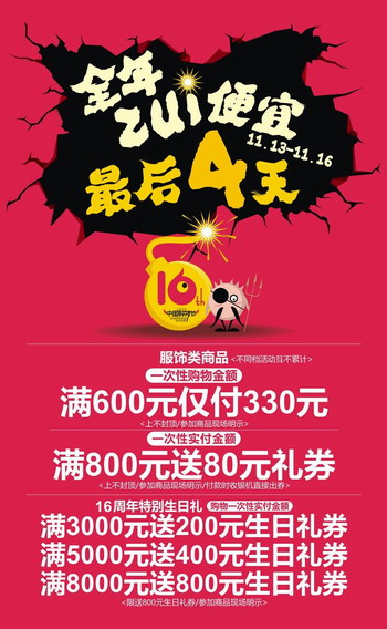 袁幸福透露,此次化妝品的折扣力度接近底線,最大的力度是8折,優(yōu)惠后的價格甚至比香港還便宜。而幾乎從不打折的優(yōu)衣庫,也會在正店慶當(dāng)日(11月16日)推出5.5折的活動。“我們80%以上的品牌從11號開始就會推出相關(guān)活動,而10%的一線品牌會在14號-16號這3天推出最大的優(yōu)惠活動。”