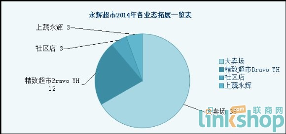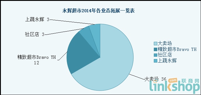 據(jù)聯(lián)商網(wǎng)統(tǒng)計(jì)數(shù)據(jù)顯示,2014年永輝實(shí)現(xiàn)多元化業(yè)態(tài)布局,54家新門(mén)店中大賣(mài)場(chǎng)36家、Bravo YH精品超市12家、社區(qū)店3家、新業(yè)態(tài)上蔬永輝3家。