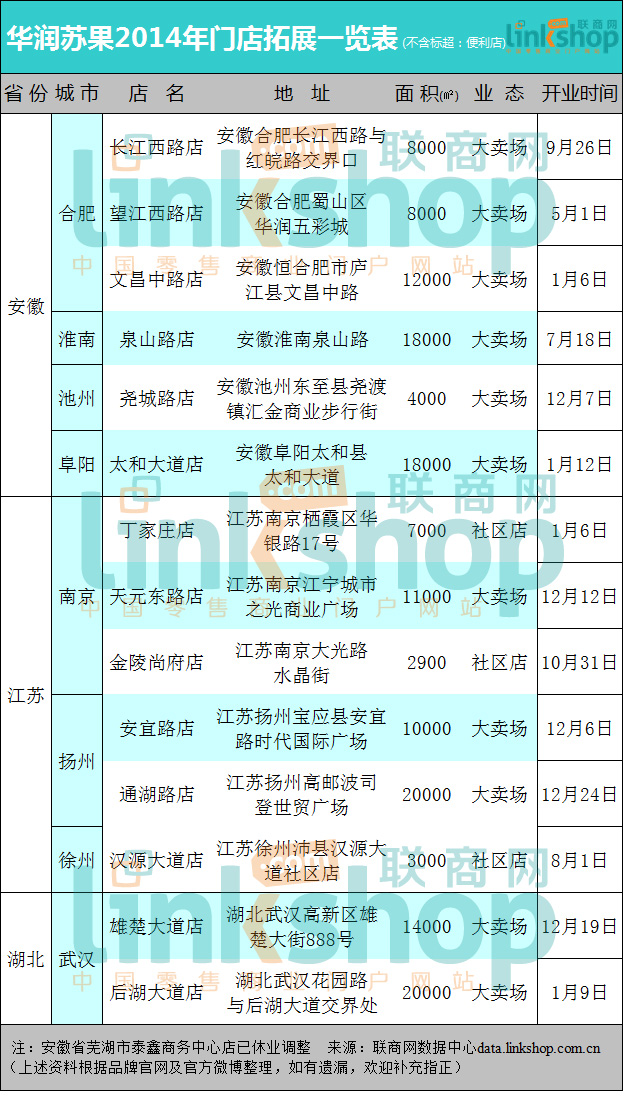 蘇果推行密集型加盟的市場拓展戰(zhàn)略,集中布局在江蘇、安徽、湖北3個省份。據(jù)聯(lián)商網(wǎng)統(tǒng)計,2014年蘇果共拓展開店129家,包括便利店和標(biāo)超115家,購物廣場和社區(qū)店14家,且這14家社區(qū)店和標(biāo)超全部布局在以上3省,其中安徽、江蘇各家、湖北2家。就各省的新店布點來看,地域分布同樣比較集中。聯(lián)商網(wǎng)數(shù)據(jù)顯示,安徽新店有3家集聚在合肥;江蘇新店有3家設(shè)在南京,2家在揚州;湖北新店則全部設(shè)在武漢。