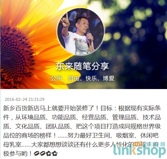 聯(lián)商網(wǎng)消息:近日,記者從胖東來董事長于東來的微博上了解到,目前,新鄉(xiāng)胖東來百貨新店馬上就要開始裝修了,正在意見收集中。