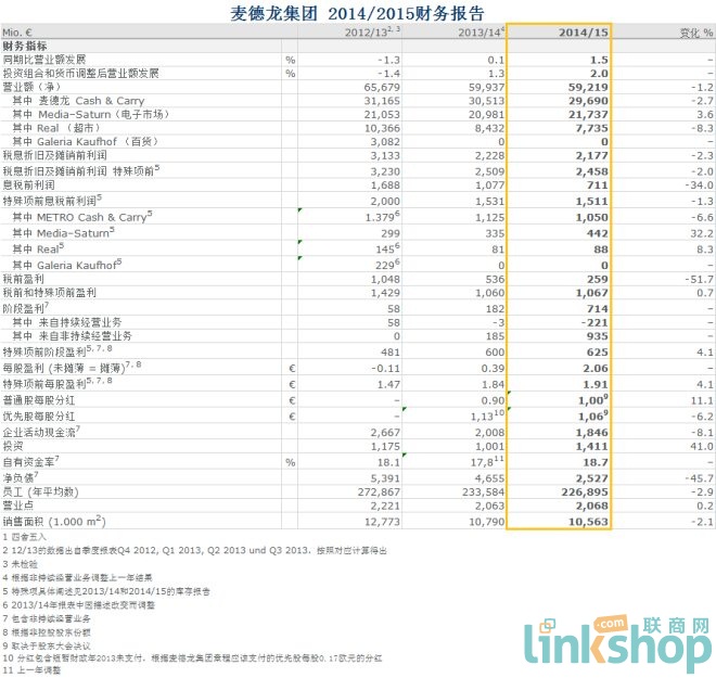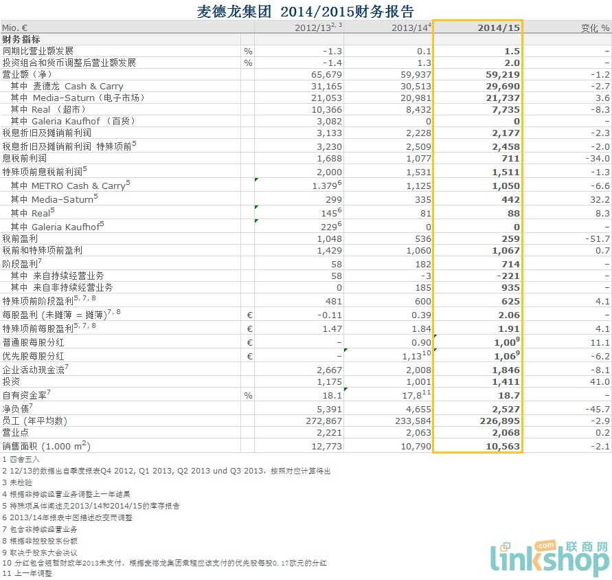 聯(lián)商網(wǎng)消息:德國麥德龍集團發(fā)布2014/2015財務(wù)報告,報告顯示,2014/15年度麥德龍集團的營業(yè)額和息稅前利潤與上一年度同期相比均有小幅度下滑,凈營業(yè)額從599.37億歐元降到592.19億歐元,息稅前利潤從10.77億歐元下降到7.11億歐元。