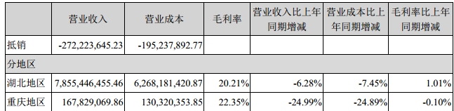 從區(qū)域分布看,湖北省市場實現(xiàn)營業(yè)收入78.55億元,同比下降6.28%,占公司總營業(yè)收入的97.91%;重慶市場實現(xiàn)營業(yè)收入1.68億元,同比下降24.99%,占公司總營業(yè)收入的2.09%。