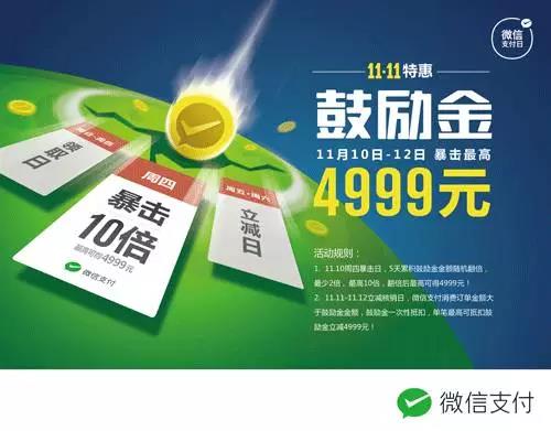 據(jù)悉,11月10日(周四),在超市發(fā)使用微信支付,除了能領(lǐng)取當(dāng)天的鼓勵(lì)金,本周內(nèi)領(lǐng)取的鼓勵(lì)金總額在當(dāng)天可以暴擊2-10倍,最高10倍。
