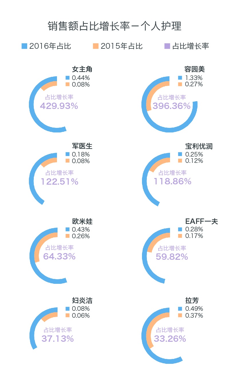 個(gè)人護(hù)理在總銷售額中的占比,因季節(jié)變化增幅較大。各品牌銷售占比較為分散。