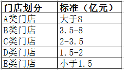 據(jù)了解,歐尚超市根據(jù)營業(yè)額將所有門店劃分為A、B、C、D、E五類門店。營業(yè)額在1.5億元以下的就是E類門店。具體劃分如下: