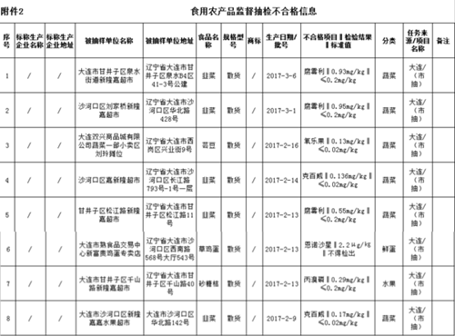 據(jù)了解,抽查發(fā)現(xiàn)大連市甘井子區(qū)泉水街道新隆嘉超市(韭菜)、沙河口區(qū)劉家橋新隆嘉超市(韭菜)、沙河口區(qū)嘉新隆超市(韭菜)、甘井子區(qū)松江路新隆嘉超市(韭菜)、大連市甘井子區(qū)千山路新隆嘉超市(砂糖橘)和大連市沙河口區(qū)新隆嘉嘉水果超市(韭菜),在此次抽檢中檢出不合格產(chǎn)品。此外,大連雙興商品城有限公司蔬菜一部小賣區(qū)劉玲攤位(蕓豆)、大連市熟食品交易中心新富貴雞蛋專賣店(草雞蛋)也檢測(cè)為不合格產(chǎn)品。