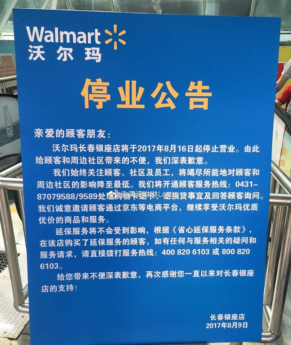 沃爾瑪長春銀座店將于8月16日起停止?fàn)I業(yè)