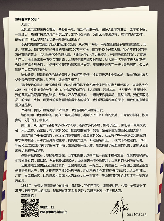 面對(duì)今天的困境,我不會(huì)逃避,我將和我的兒子李名宇帶領(lǐng)所有興隆人重新再來(lái)。興隆將改變戰(zhàn)略,停止發(fā)展連鎖的步伐,全力以赴做好現(xiàn)有門店。認(rèn)認(rèn)真真,踏踏實(shí)實(shí),從頭開始,重新創(chuàng)業(yè)。