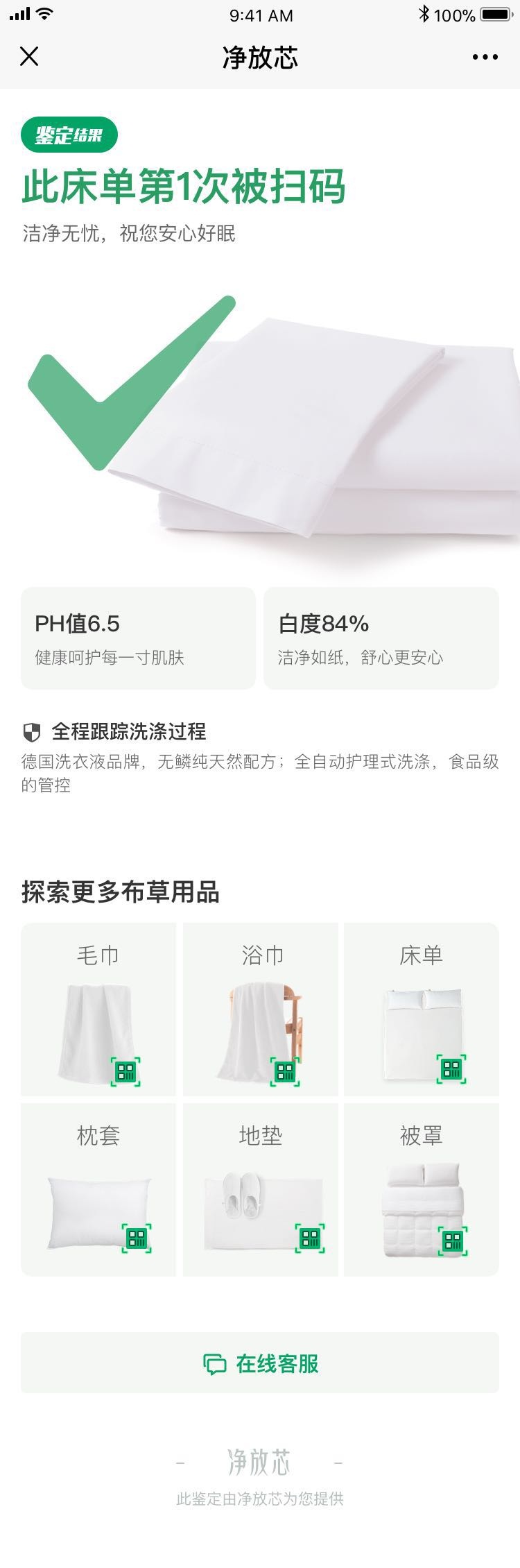 “凈放芯”布草經(jīng)水洗廠完成洗滌后,相應狀態(tài)將在云端平臺被更新為“已清洗”,而后配送回各大酒店供工作人員更換至每一個房間。消費者入住后,掃描布草上“凈放芯”智能芯片上的二維碼,即可查詢云端的布草信息,包括第幾次掃描等?吹绞謾C提示后,即可放心使用。