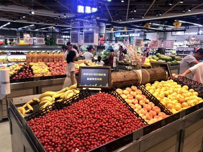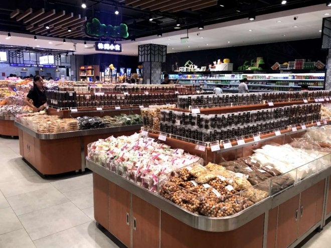 陳列效率高于正常門店三分之一!目前全店SKU數(shù)8000個,其中食品、用品SKU為6000個,動銷率80%。目前該店生鮮占比達60%,食品占比30%,用品占比10%,全店毛利率22%,月均人效約5萬,月均坪效1708元。