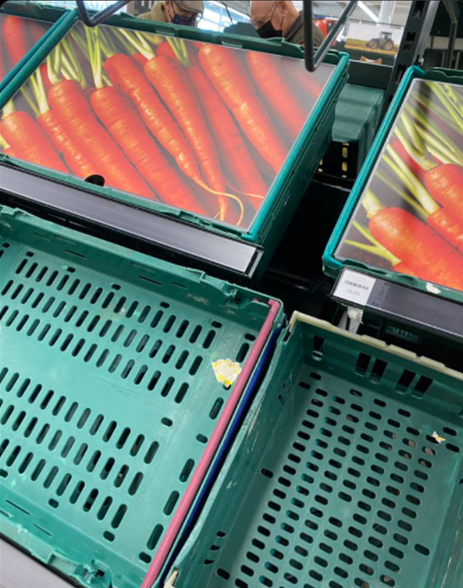 根據(jù)網(wǎng)友分享的圖片顯示,英國當(dāng)?shù)匾恍┏械氖卟素浖苌蠑[放的不是新鮮的蔬菜,而是蔬菜照片,網(wǎng)友們戲稱為“紙?zhí)J筍”、紙?zhí)}卜”。