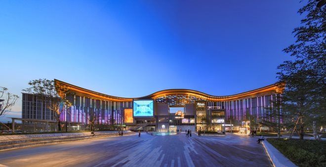 今年4月底新開業(yè)的成都世茂廣場,是龍泉驛區(qū)建筑體量最大的商業(yè)綜合體,開業(yè)后填補了區(qū)域標桿性商業(yè)的空白,與周邊住宅形成了“區(qū)域商業(yè)+大型住宅居民區(qū)”的城市副中心發(fā)展模式。世茂結(jié)合項目靠近三圣花鄉(xiāng)、天鵝湖生態(tài)區(qū)、許燎原博物館等自然及藝術中心的特征,將其定位為“微度假生活方式中心”,在建筑設計中巧妙融入龍泉山脈特色,設計出難得一見的「天然多首層」,長度達280m的「花街漫道」,鋼結(jié)構點駁接式玻璃幕墻「靈棲樹屋」,不規(guī)則網(wǎng)殼式結(jié)構的“花生皮”穹頂,打造自然與人文完美融合的全新生態(tài)消費體驗空間。同時,在室內(nèi)外的多個區(qū)域打造了城市景觀公園、演藝廣場、屋頂大草坪及兒童游樂空間等與度假、休閑、社交等密切關聯(lián)的主題空間,盡可能還原自然生活場景。