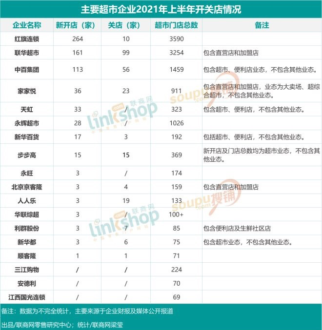 ▲聯(lián)商對于主要超市企業(yè)2021年上半年開關(guān)店情況的梳理