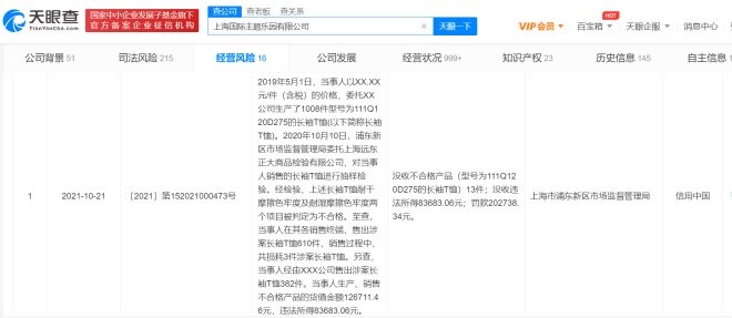 近日,天眼查App顯示,迪士尼關(guān)聯(lián)公司上海國(guó)際主題樂(lè)園有限公司新增一條行政處罰信息,處罰事由為當(dāng)事人銷售的長(zhǎng)袖T恤經(jīng)抽樣檢驗(yàn)被判定為不合格,處罰結(jié)果為沒(méi)收違法所得83683.06元并罰款202738.34元,處罰單位為上海市浦東新區(qū)市場(chǎng)監(jiān)督管理局。