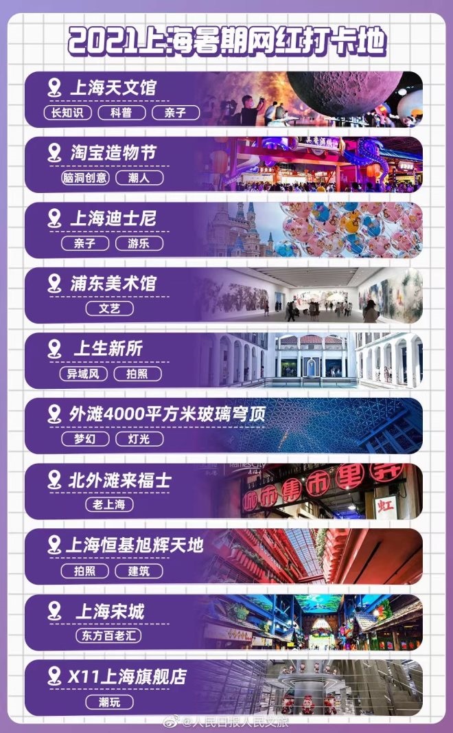 人民日報(bào)公布的上海新晉網(wǎng)紅打卡點(diǎn)當(dāng)中,既有可以探索宇宙奧秘的上海天文館、看腦洞創(chuàng)意的淘寶造物節(jié),還有被稱為亞洲第一美術(shù)館的浦東美術(shù)館、開放式的魔都文化藝術(shù)生活圈上生新所、感受東方百老匯魅力的上海宋城,以及上海外灘4000平方米玻璃穹頂、北外灘來福士等景點(diǎn)。