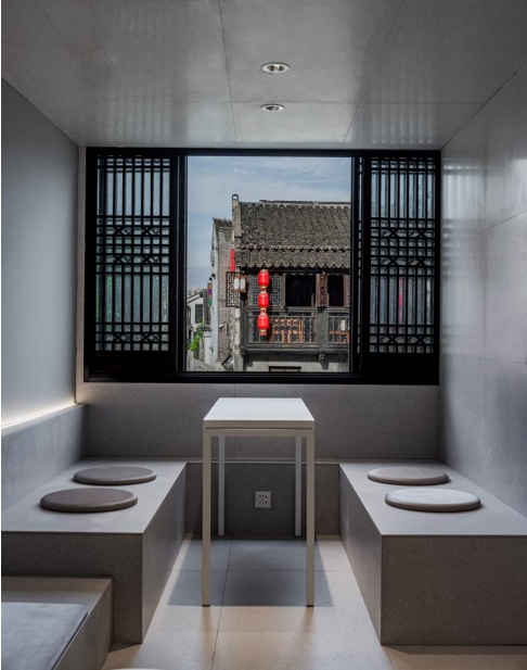 在保留建筑原有特色的同時(shí),喜茶還對(duì)古建筑進(jìn)行了現(xiàn)代化的設(shè)計(jì)。比如為了改變層低采光差的問(wèn)題,喜茶創(chuàng)造性地打通了建筑內(nèi)一至三層靠窗的樓板。這種大膽的空間布局設(shè)計(jì),不僅在功能性上讓門(mén)店采光更好,室內(nèi)更加明亮,同時(shí)也巧妙地實(shí)現(xiàn)了質(zhì)感十足的光影效果。