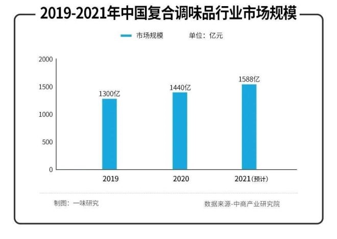 根據中商產業(yè)研究院發(fā)布的《2021年“十四五”中國復合調味品行業(yè)市場前景及投資研究報告》顯示,我國復合調味料市場規(guī)模由2016年的854億元增至2019年的1300億元,年均復合增長率為11.08%。