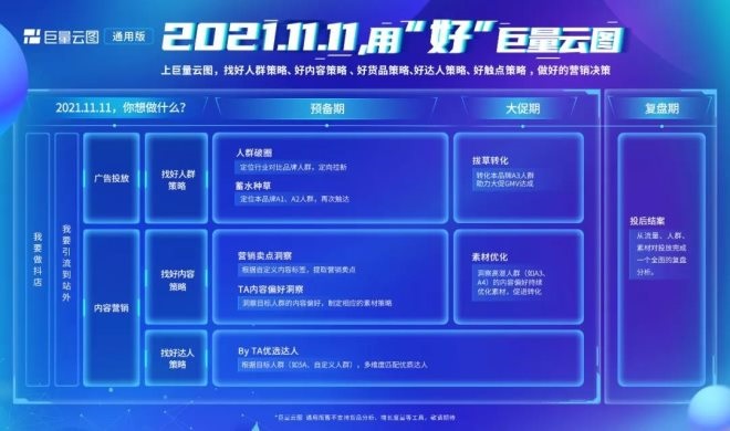 此外,今年雙11期間,巨量云圖還推出了5大核心策略——“好人群、好觸點(diǎn)、好貨品、好內(nèi)容、好達(dá)人”,幫助商家在大促前中后,做好的營銷決策;并且,中小商戶使用巨量縱橫超級管理員賬號登錄巨量云圖,即可一鍵登錄通用版,獲取大促敏感人群包、以及直播間人群策略、垂類內(nèi)容榜單等多項(xiàng)新功能權(quán)益。