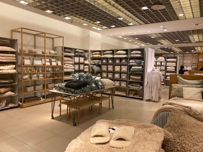 tbh這種適合年輕一族的大面積撞色設(shè)計,與旁邊極簡風(fēng)格的ZARA HOME形成了強(qiáng)烈對比。喜歡逛ZARA HOME的應(yīng)該能聯(lián)想到,全國門店同意暖黃色調(diào),門店之間在選品上也相對統(tǒng)一,在定價上更是圍繞“小資”一族,價格不會貴的離譜,讓大眾普遍都消費得起。反觀tbh門店中,動輒4000元一套的四件套,2000一套的睡衣,不禁讓人直呼溢價嚴(yán)重。