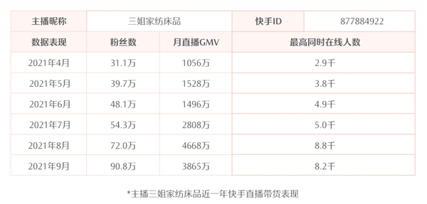河北衡水的快手家紡主播三姐(快手ID:877884922)今年三四月時(shí)場(chǎng)均GMV只有25萬(wàn)左右。四月份,快手電商運(yùn)營(yíng)小二開(kāi)始對(duì)接扶持,鼓勵(lì)主播多發(fā)內(nèi)容,勤復(fù)盤,只用了兩三個(gè)月的時(shí)間,場(chǎng)均GMV就增長(zhǎng)到了70至90萬(wàn)。到7月份,三姐通過(guò)和外部服務(wù)商合作操盤大活動(dòng)獲得全方位提升,單場(chǎng)峰值GMV突破了550萬(wàn)。8月份,在她自己的努力下,單場(chǎng)峰值GMV突破1000萬(wàn),場(chǎng)均GMV可以到達(dá)200萬(wàn)。相當(dāng)于不到半年的時(shí)間,三姐通過(guò)學(xué)習(xí)專業(yè)化運(yùn)營(yíng)實(shí)現(xiàn)了10倍的增長(zhǎng)。目前,三姐的每一場(chǎng)直播都會(huì)更加系統(tǒng)性使用STAGE方法論。