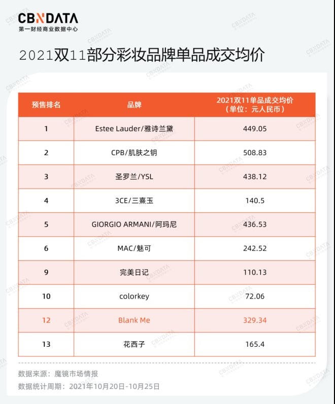 除了明星品牌們的排位輪換,國貨彩妝圈還有“黑馬”殺出。Blank Me在預(yù)售首日空降彩妝榜第三,僅次于雅詩蘭黛、蘭蔻。這個成立于2016年,專攻亞洲女性底妝的品牌,靠著小黑盒、小銀盒兩款氣墊粉霜,一度領(lǐng)跑今年雙11國貨彩妝榜。值得注意的是,Blank Me的定價堪稱性價比國貨彩妝中的一股“逆流”。其雙11單品成交均價高達329元,高于MAC、3CE等國際品牌,而完美日記、colorkey的單品成交均價在百元上下。