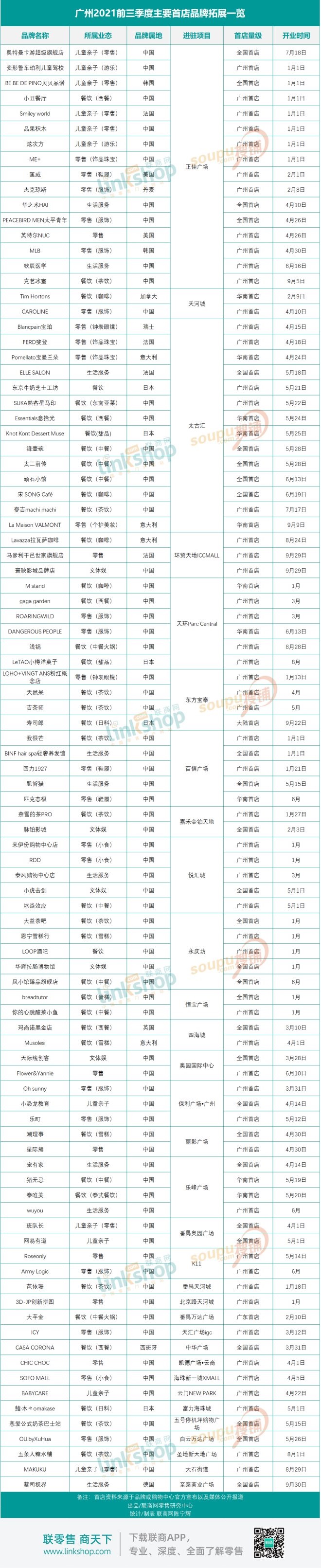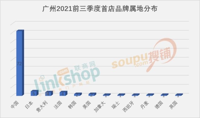 據(jù)聯(lián)商網(wǎng)零售研究中心統(tǒng)計,2021前三季度(1-9月),入駐廣州的首店品牌(首店量級在城市首店以上)數(shù)量達到95家,其中不乏大陸首店壽司郎,全國首店BE BE DE PINO、ELLE SALON、瑪尚諾黑金店、CASA CORONA、PEACEBIRD MEN太平青年等高量級的首店品牌。