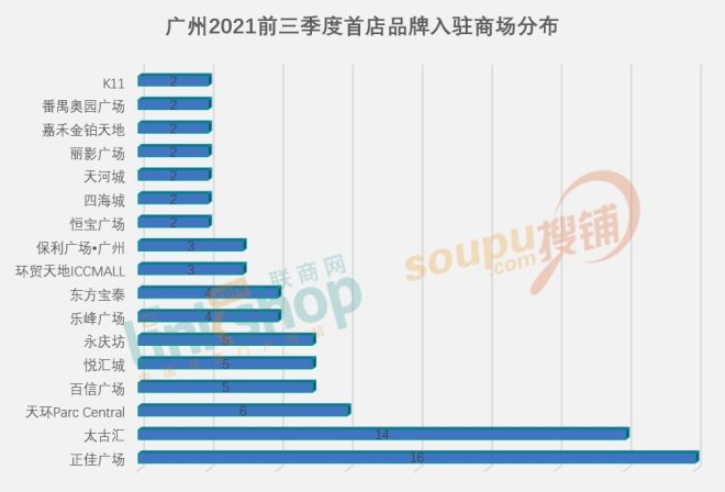 從商業(yè)項目具體分布上看,引入首店數(shù)量最多的是正佳廣場,多達16家,緊隨其后的是14家的太古匯。其余項目入駐數(shù)量均低于10家,其中天環(huán)Parc Central有6家、百信廣場5家、悅匯城5家、永慶坊5家、樂峰廣場和東方寶泰各4家、9月份新開業(yè)的環(huán)貿(mào)天地ICCMALL也有4家,其他諸如天河城、K11、番禺奧園廣場、嘉禾金鉑天地等首店開業(yè)量均達到了2家。