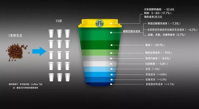 同時(shí)從《華爾街日?qǐng)?bào)》披露的渣打銀行統(tǒng)計(jì)的一杯星巴克咖啡的成本結(jié)構(gòu)圖來看,原材料成本在一杯大杯拿鐵咖啡的成本構(gòu)成中占比非常低,占據(jù)成本構(gòu)成前兩位的是租金成本和門店運(yùn)營成本,分別高達(dá)26.1%和15%,而利潤則為17.7%。