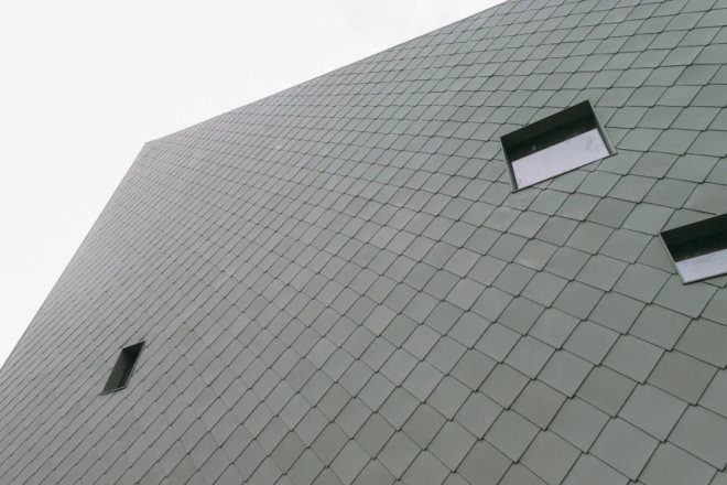 建筑的背面鋪滿了瓦片單元,與整體的不規(guī)則輪廓相結(jié)合,給人以強(qiáng)烈的藝術(shù)觀感。