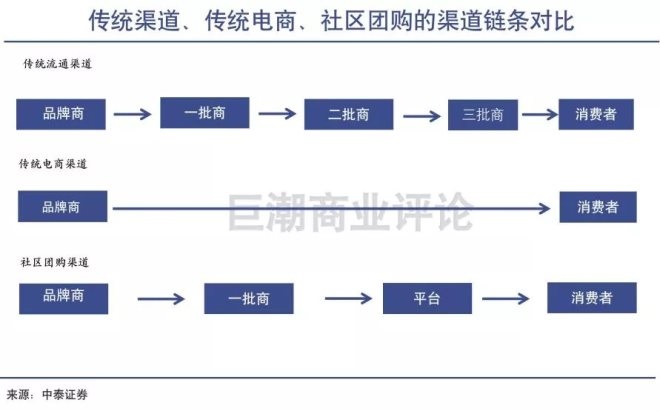 中泰證券指出,傳統(tǒng)流通渠道,通過廠家-一批商-二批商-終端零售商層層加價后,相對出廠價的加價率在45%-50%。而社區(qū)團購的渠道鏈條為廠家-供應(yīng)商-平臺-消費者,通過縮短供應(yīng)鏈,提升效率,降低了25%-30%的渠道加價。