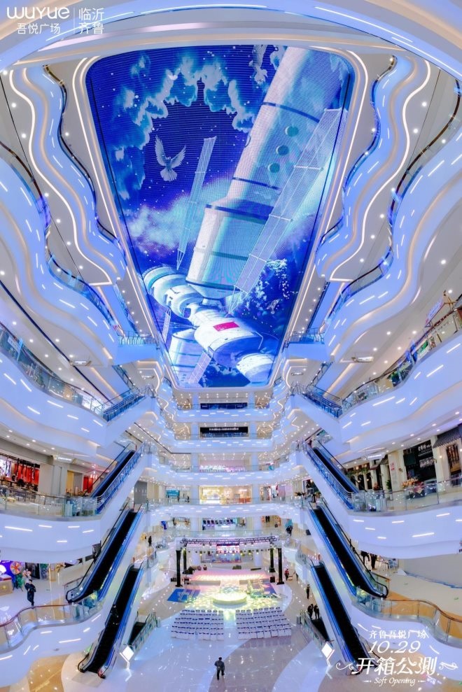 在項(xiàng)目入口處,采用2018年平昌冬奧會(huì)閉幕式上的“北京八分鐘”的冰屏技術(shù),打造巨型室內(nèi)觀光冰屏,將智慧科技與體驗(yàn)商業(yè)完美結(jié)合;同時(shí)打造了臨沂最大室內(nèi)“幻境天幕”,為處在繁華都市中的消費(fèi)者帶來(lái)置身浩渺銀河的沉浸式體驗(yàn)。