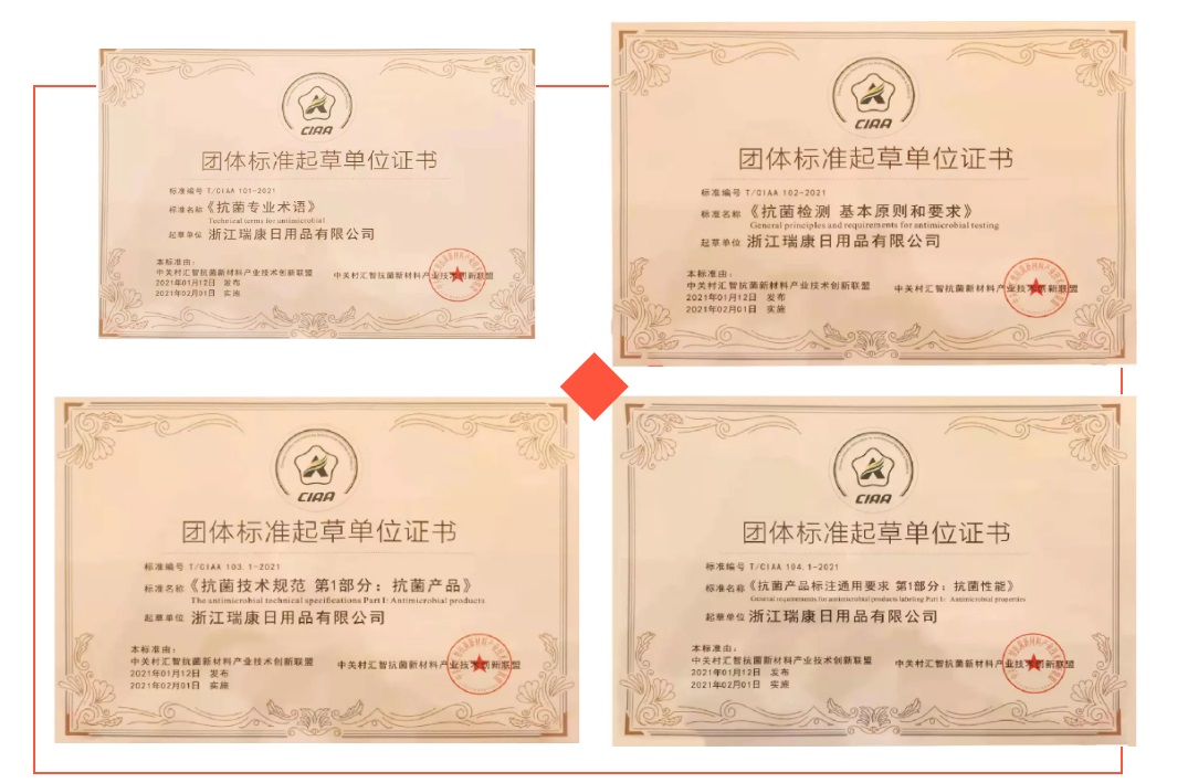 此外,瑞康憑借對(duì)抗菌產(chǎn)品的研發(fā)以及對(duì)抗菌技術(shù)的掌握和推廣,與抗菌產(chǎn)業(yè)CIAA共建抗菌新標(biāo)準(zhǔn),參與《抗菌檢測(cè) 基本原則和要求》、《抗菌技術(shù)規(guī)范 第1部分:抗菌產(chǎn)品》、《抗菌產(chǎn)品標(biāo)注通用要求 第1部分:抗菌性能》、《抗菌專(zhuān)業(yè)術(shù)語(yǔ)》四大板塊標(biāo)準(zhǔn)制定,推動(dòng)抗菌日用品新高度,在10月28日第13屆中國(guó)抗菌產(chǎn)業(yè)發(fā)展大會(huì)上被授予團(tuán)體標(biāo)準(zhǔn)起草單位證書(shū),為抗菌市場(chǎng)的規(guī)范性做出了不可或缺的貢獻(xiàn)。
