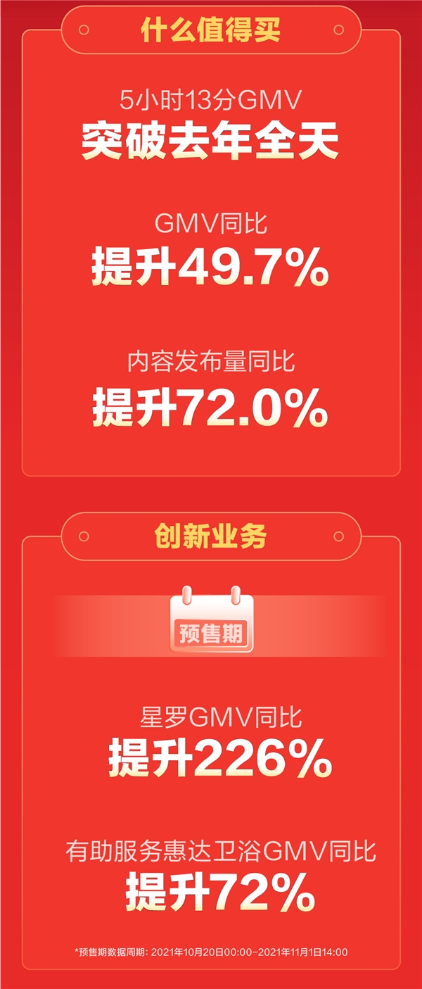 其中,開門紅當天(31日20點至11月1日20點),消費內容社區(qū)什么值得買GMV同比增長49.7%,創(chuàng)新業(yè)務星羅更是自預售開始截至11月1日14點,實現GMV同比增長226%。