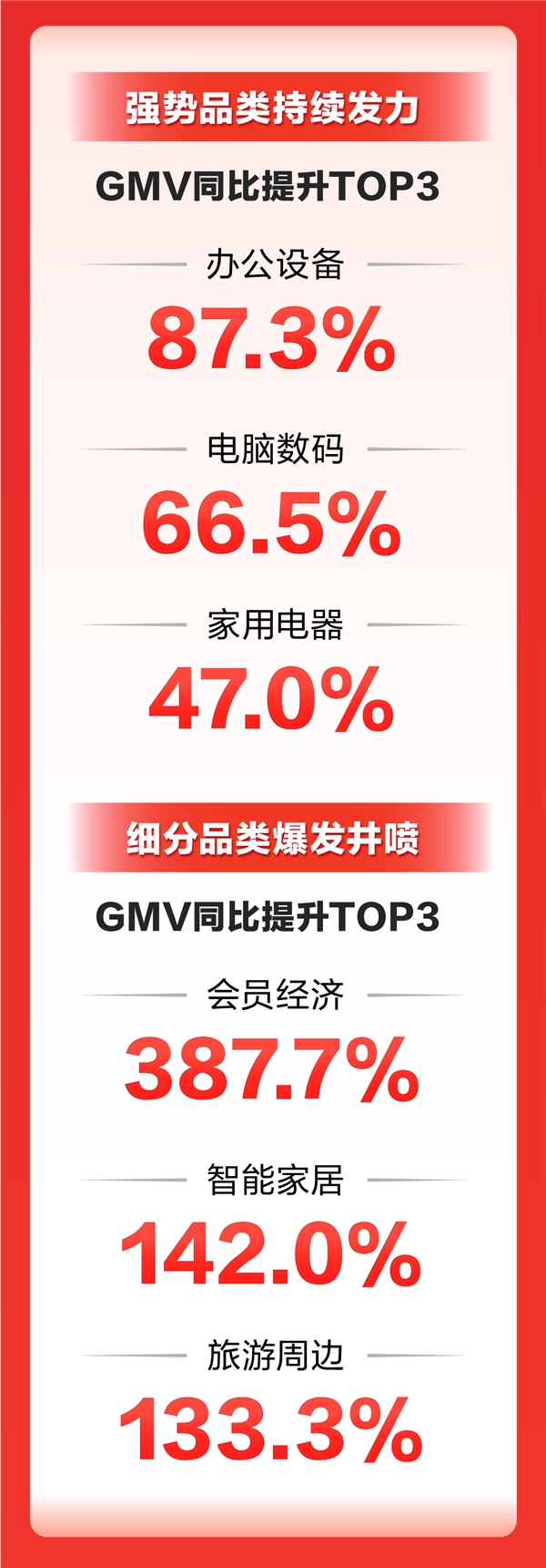 戰(zhàn)報顯示,辦公設備、電腦數碼、家用電器三大類目分別實現了87.3%、66.5%、47%的GMV同比增長,增幅排名全站各大品類TOP3;細分品類中,會員經濟、智能家居、旅游周邊三大品類表現較為搶眼,會員經濟更是以387.7%的同比增幅領跑全場。