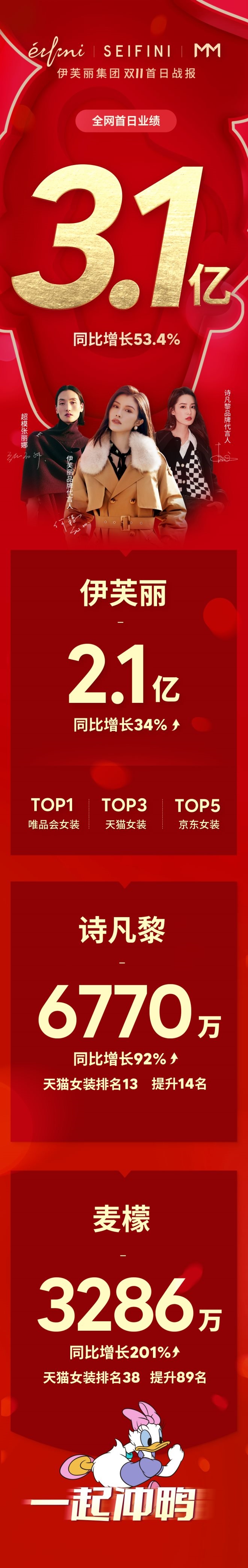 伊芙麗集團雙11首日戰(zhàn)報:業(yè)績3.1億 同比增長53.4%