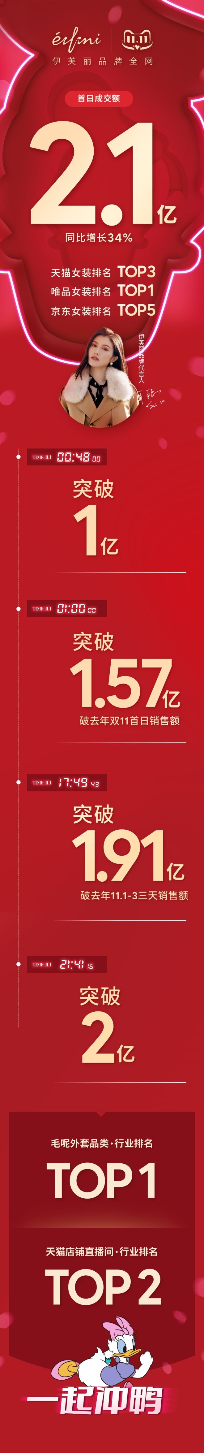 其中伊芙麗品牌首日業(yè)績2.1億,同比增長34%,位居天貓女裝第3,唯品會女裝第1,京東女裝第5。