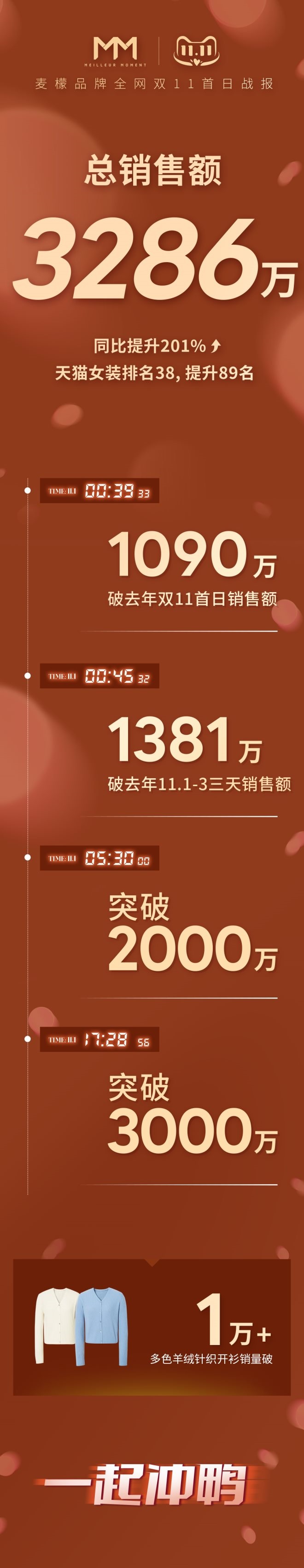 麥檬品牌45分鐘突破去年雙11三天業(yè)績,首日全網(wǎng)業(yè)績3286萬,同比增長201%,天貓女裝排名38,提升89名。