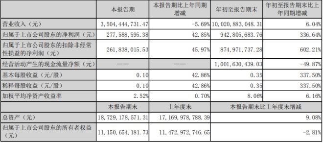 其中第三季度實(shí)現(xiàn)營(yíng)業(yè)收入35.04億元,同比下降5.69%;歸屬于上市公司股東的凈利潤(rùn)2.78億元,同比增長(zhǎng)42.85%。